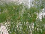 | Ο Πάπυρος είναι το όνομα που έδωσαν στο χαρτί του αρχαίου κόσμου, και στο φυτό από το οποίο αυτό παραγόταν. Είναι ένα είδος που εξακολουθεί να βλαστάνει στο έλος Χουλέχ στη βόρεια Παλαιστίνη ήταν πολύ συνηθισμένο στο δέλτα του Αιγυπτιακού Νείλου. Τα πρασινωπά άνθη του μοιάζουν με μεγάλες σκούπες και φτάνουν στο ύψος των 3 μέτρων. Τα τριγωνικά κοτσάνι ασχίζονταν σε λουρίδες, και καρφώνονταν μαζί σε δύο στρώματα για να γίνει το χαρτί. | ![]() |